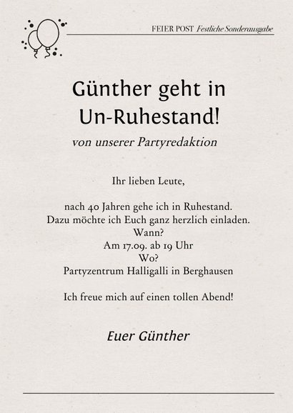 Einladung Feierpost Zeitung Zur Rente Kaartje2go